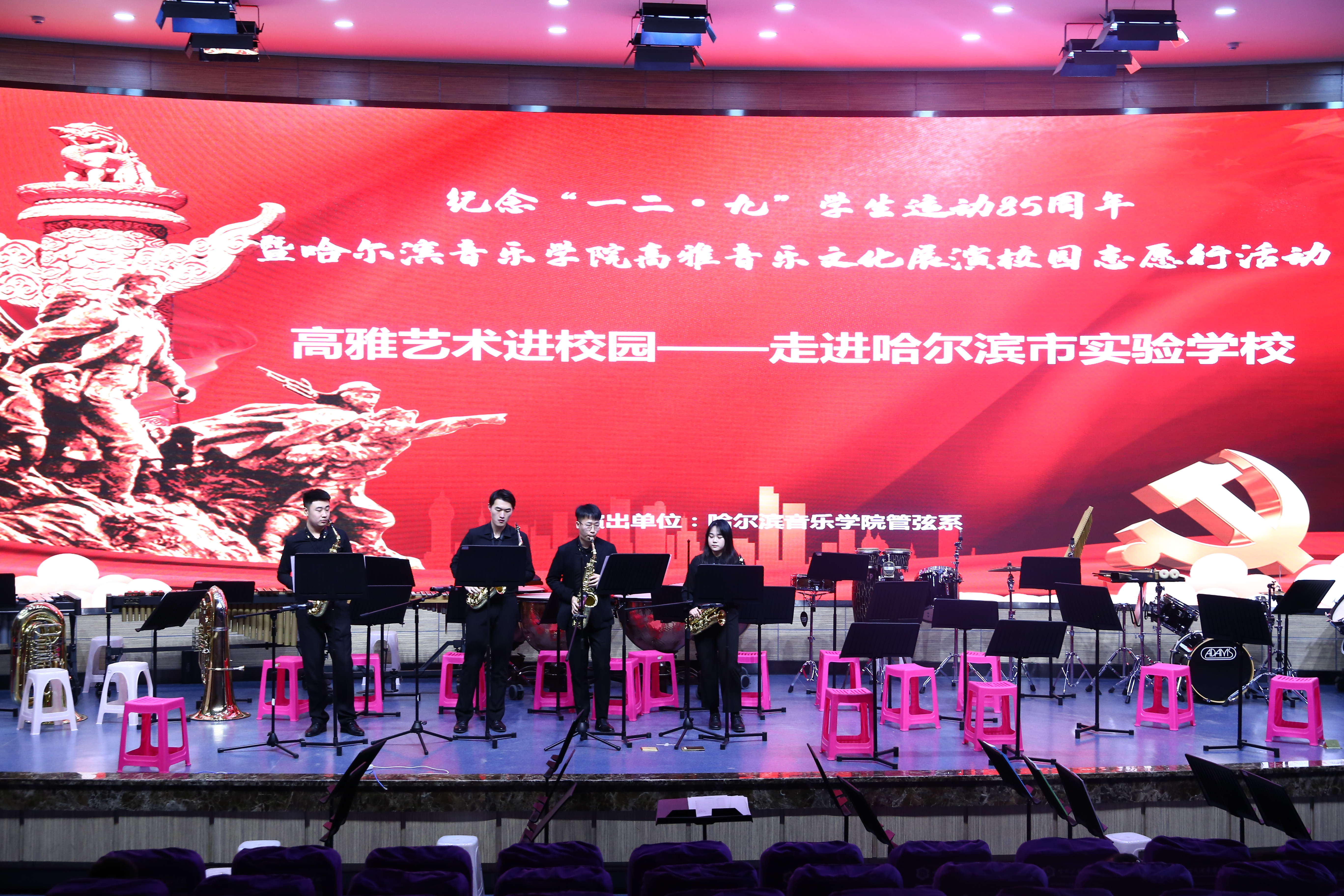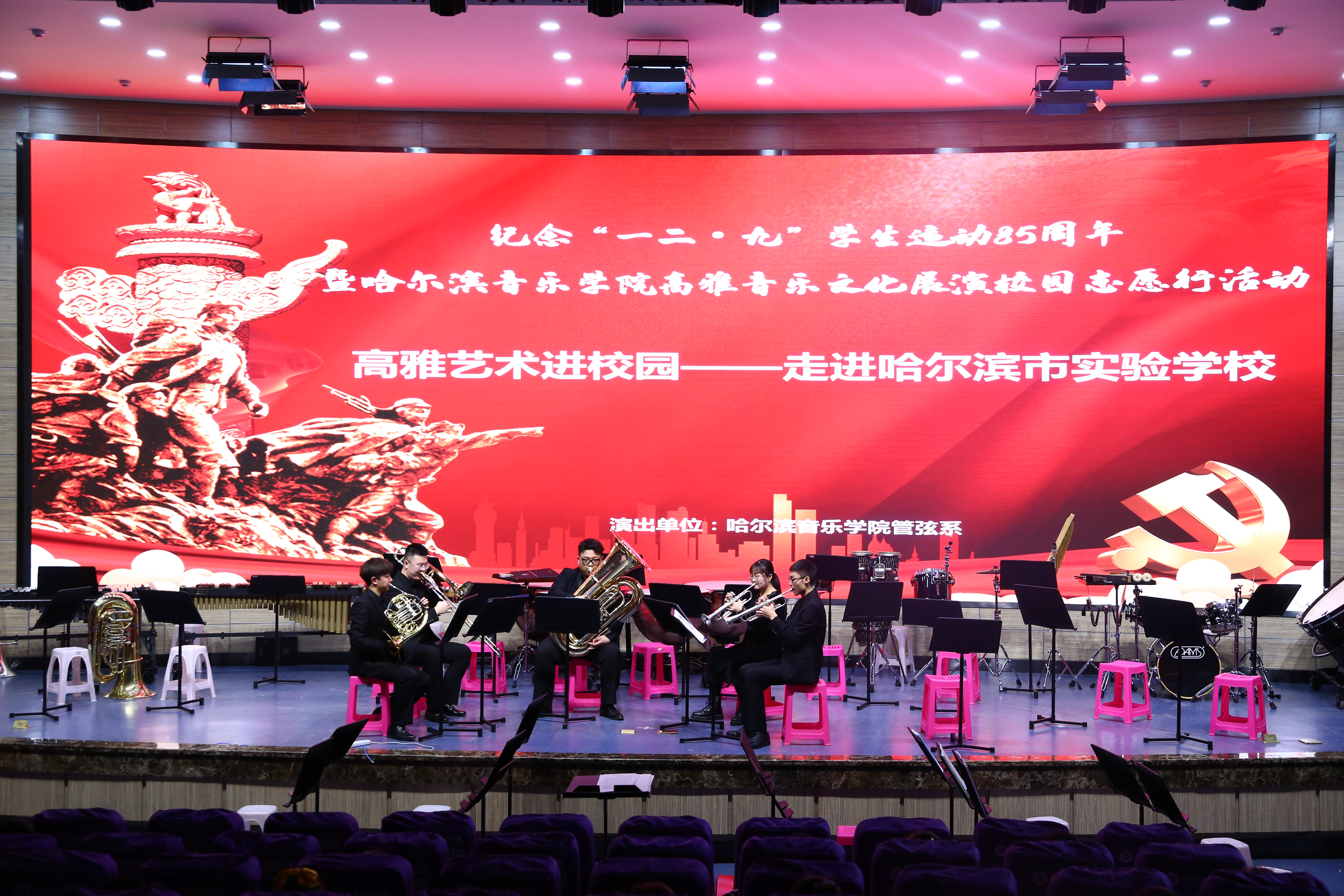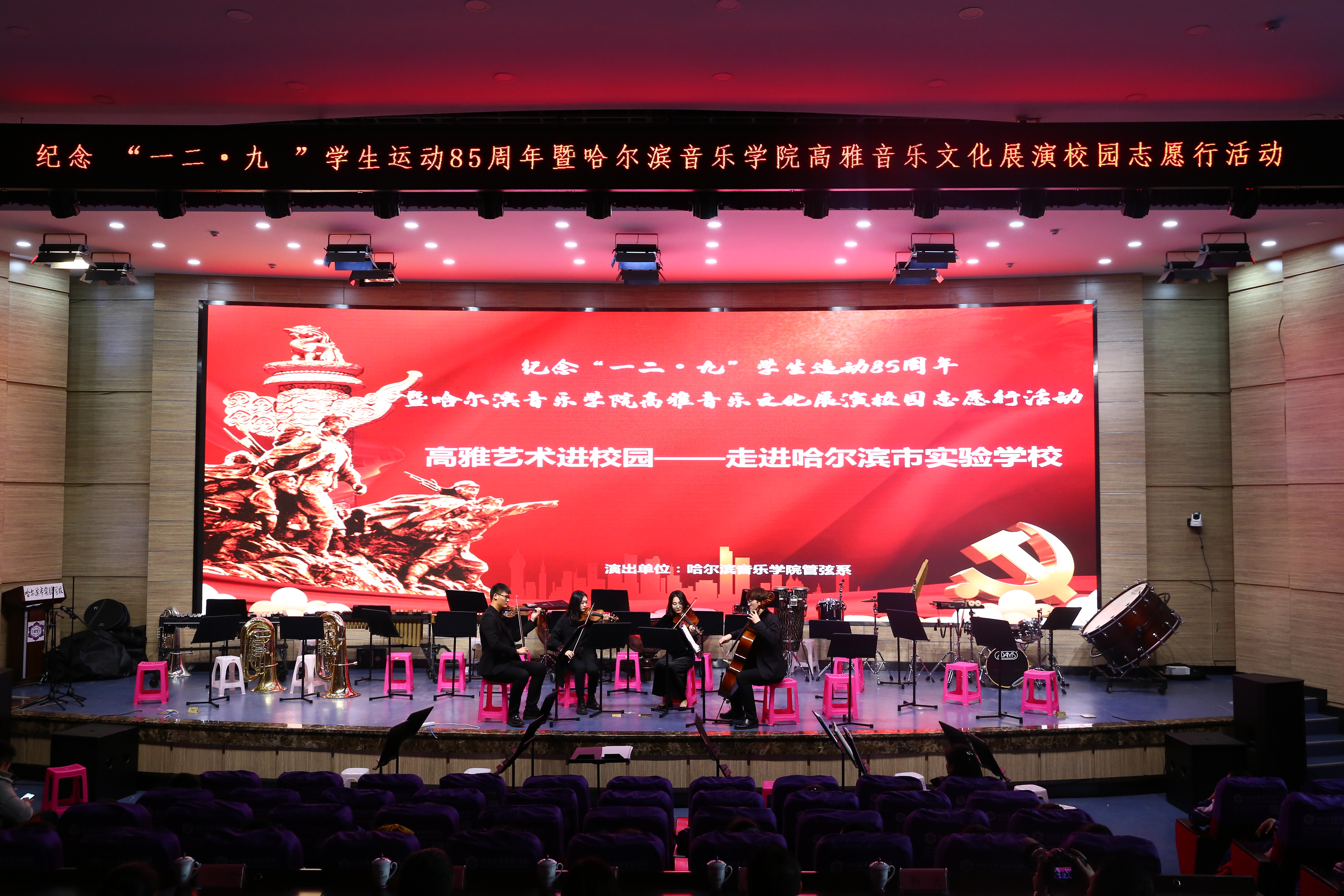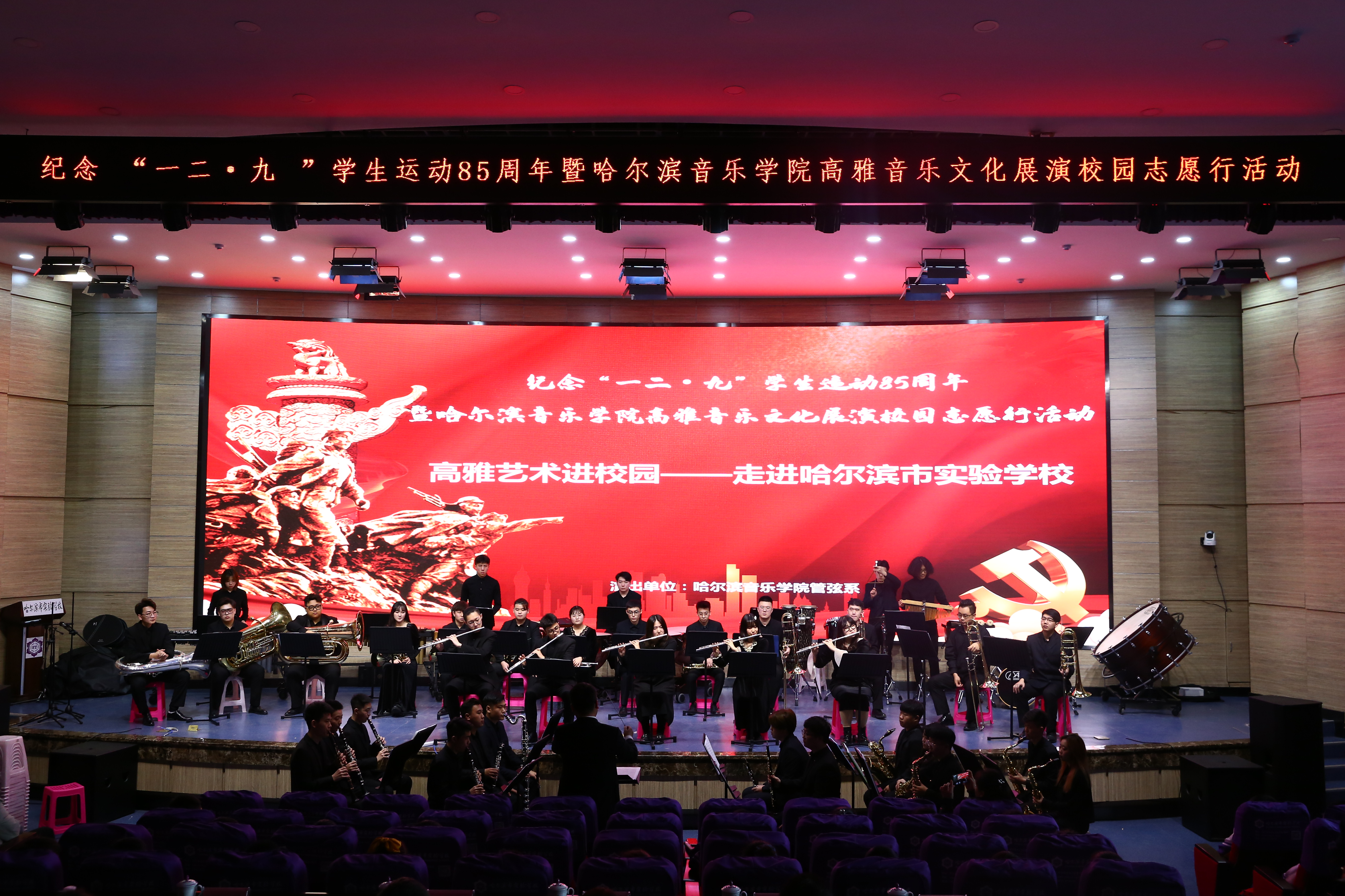 为纪念“一二·九”运动85周年,弘扬爱国主义精神,激发青年人爱国热情,树立为实现中华民族伟大复兴中国梦而不懈奋斗的远大理想,12月11日下午,管弦系党总支师生走进哈尔滨市实验学校,开展“志愿服务进校园,音乐文化暖童心”主题党日、团日活动。william威廉亚洲官方党委委员、组织部部长刘东兴,学生处副处长、学生工作部副部长、武装部副部长杨琳擘,管弦系党总支书记杨玲,管弦系副主任杨光,哈尔滨市实验学校校长郝岚、副校长战春梅、副校长王丽巍出席了活动,哈尔滨市实验学校300余名师生共同参加了活动。