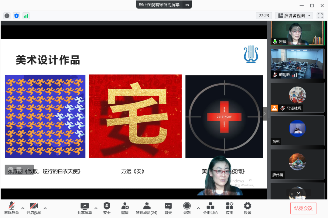 讲座中,宋蓓介绍了“突发疫情时心理与行为反应”相关内容,向学生讲述了自2019年12月底爆发并持续至今的全球化新冠疫情给人们造成的“心理应激”反应,以及由此导致的恐慌焦虑、愤怒悲观和无助无力三个主要的应激反应过程;引导同学们认识到传统 “面对面”教学方式与线上“云授课”教学方式的差别,并说明新型教学技术的应用是提升教师教学水平的新机遇;讲解了突发疫情时的心理与行为调适策略,通过对经典音乐、电影等艺术作品的赏析,使学生们深刻感受艺术的力量,掌握艺术对个体生理和心理层面的特殊影响;赏析了疫情期间涌现出的讴歌抗疫英雄、礼赞抗疫事迹的音乐作品、美术作品、摄影作品等,让学生们了解到艺术家们如何用艺术的笔触,凝聚起人民群众抗击疫情的强大精神力量。