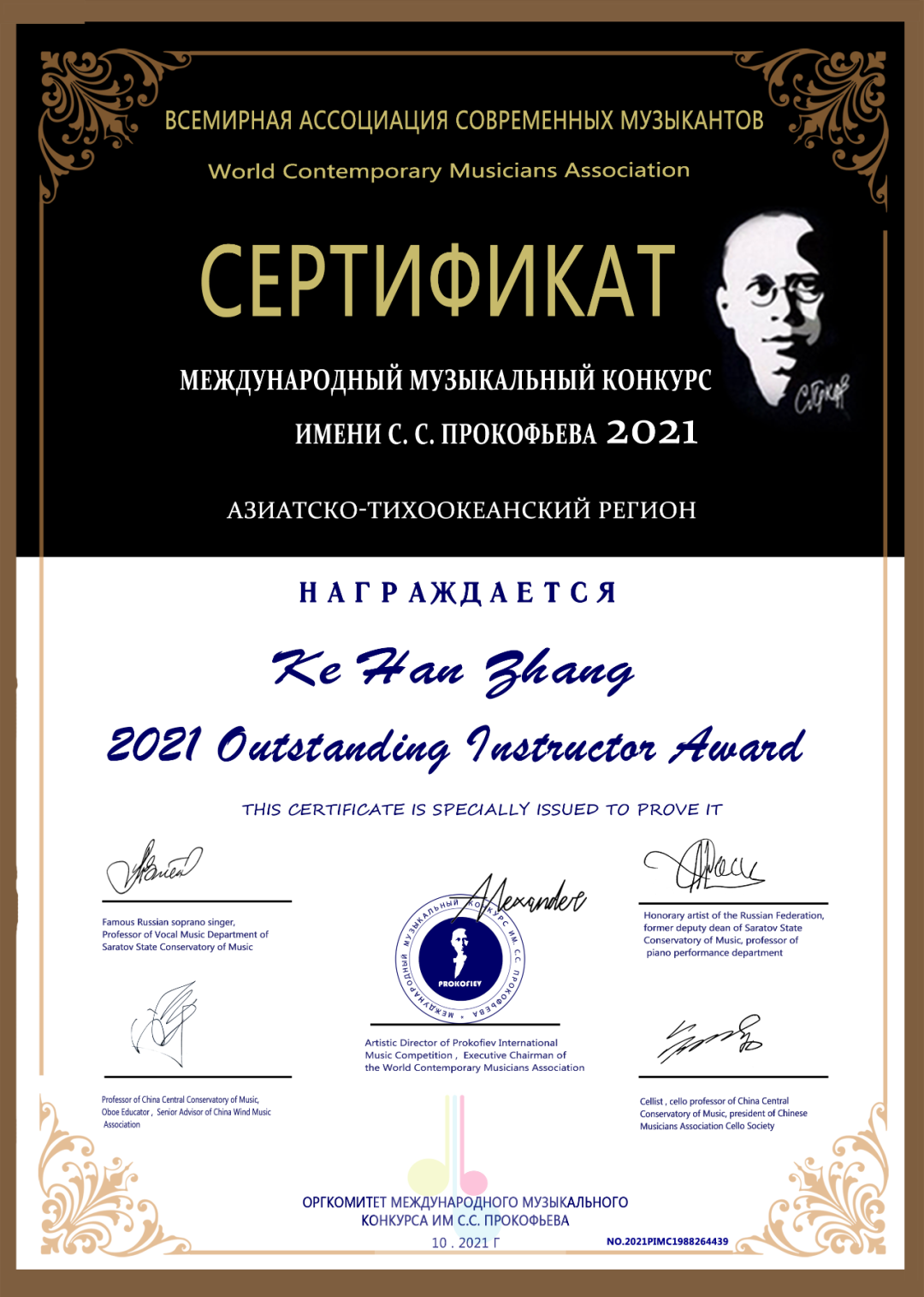 近日,在2021年普罗科菲耶夫国际音乐大赛中,我院管弦系小提琴教师张可涵受邀担任大赛陪审,并被大赛组委会授予“杰出指导教师奖”荣誉称号,获奖证书由普罗科菲耶夫国际音乐大赛评审团主席亚历山大,中央音乐学院教授白宇、俞明青等多位专家共同签名授予。