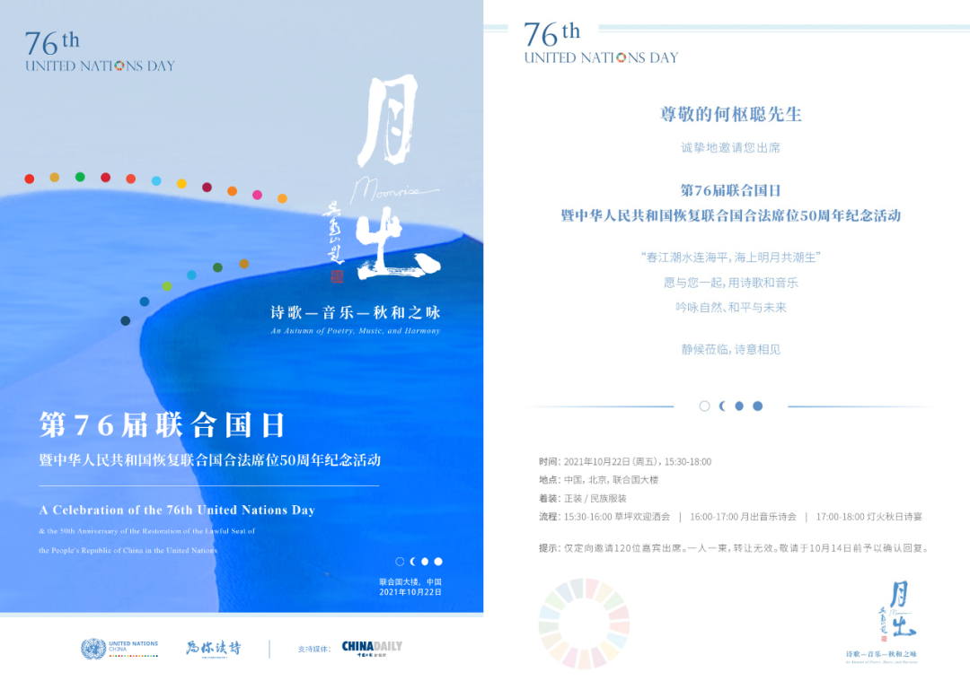 2021年是联合国成立76周年,也是新中国恢复联合国合法席位50周年。在这个特殊历史时刻,联合国驻华系统携手以诗歌为起点和纽带的国际文化艺术交流平台“为你读诗”共同举办“《月出》诗歌、音乐、秋和之咏”音乐诗会,通过全人类共通的情感语言——诗歌、音乐,呼唤理解、互信、和平与共同发展。