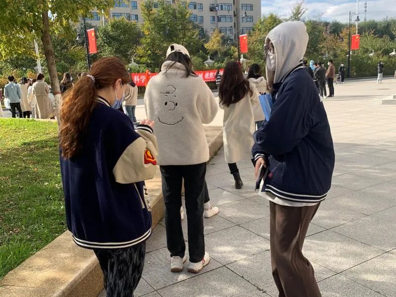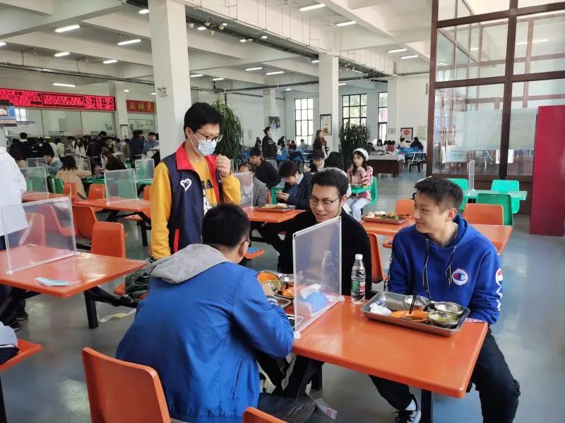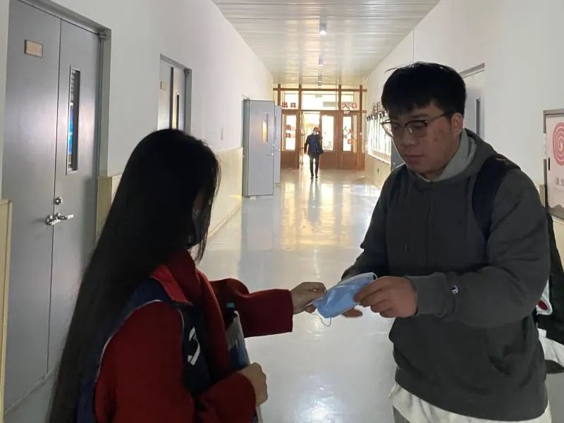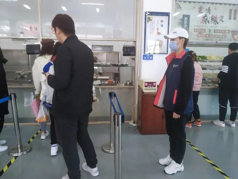 在主楼大厅内,党员志愿者提醒来往的师生佩戴口罩,减少聚集;在食堂公共区域内,党员志愿者为前往食堂就餐的同学分发口罩,提醒排队取餐的同学保持一米以上的距离,就餐时要隔位就坐;在音乐厅的核酸检测现场,党员志愿者为做核酸检测的同学提供便捷的服务,帮助工作人员做好信息采集等工作。