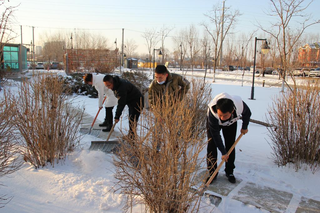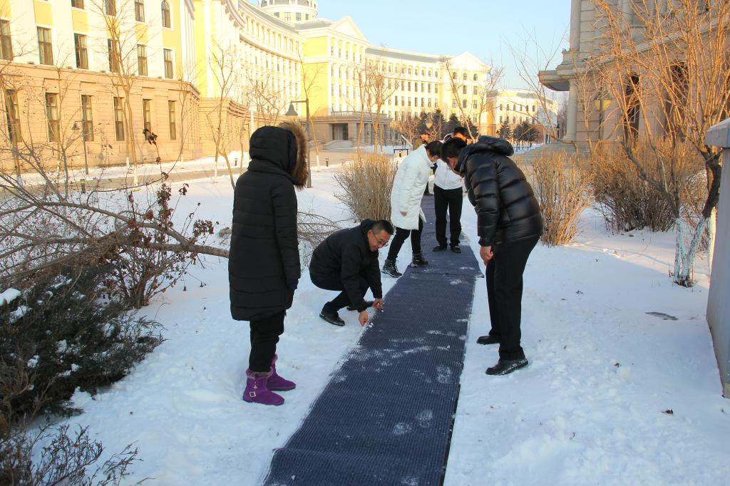 考虑到冬季降雪影响,前往地下车库的石砖小路经常积雪结冰,湿滑难行,存在安全隐患。在党支部书记丁健的带领下,支部成员一同清理了道路两端的积雪,并将防滑地毯裁剪成相应尺寸,逐条铺设、固定在石砖小路上,确保消除道路湿滑影响,保障教职工通行安全。