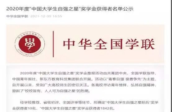 近日,由共青团中央、全国学联指导,中国青年报社、新东方教育科技集团联合开展2020年度“中国大学生自强之星”奖学金结果揭晓。我院硕士研究生张影同学获得2020年度“中国大学生自强之星”称号和奖学金。