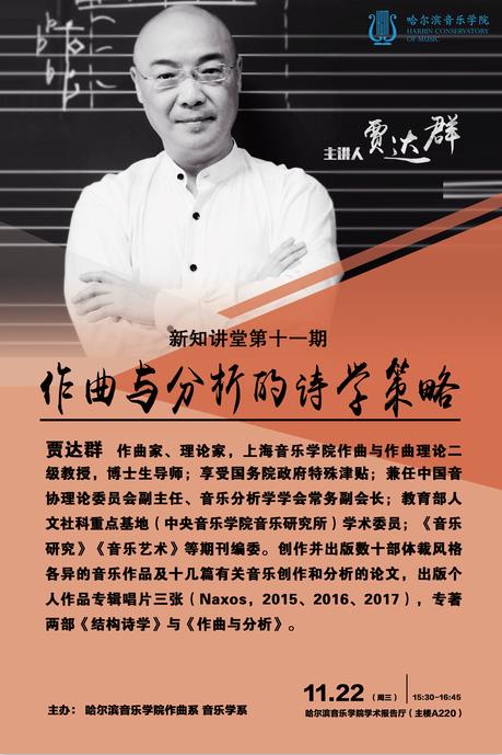 贾达群,作曲家、理论家,上海音乐学院作曲与作曲理论二级教授,博士生导师;享受国务院政府特殊津贴;兼任中国音协理论委员会副主任、音乐分析学学会常务副会长;教育部人文社科重点基地(中央音乐学院音乐研究所)学术委员;《音乐研究》《音乐艺术》等期刊编委。创作并出版数十部体裁风格各异的音乐作品及十几篇有关音乐创作和分析的论文,出版个人作品专辑唱片三张(Naxos,2015、2016、2017),专著两部《结构诗学》与《作曲与分析》。