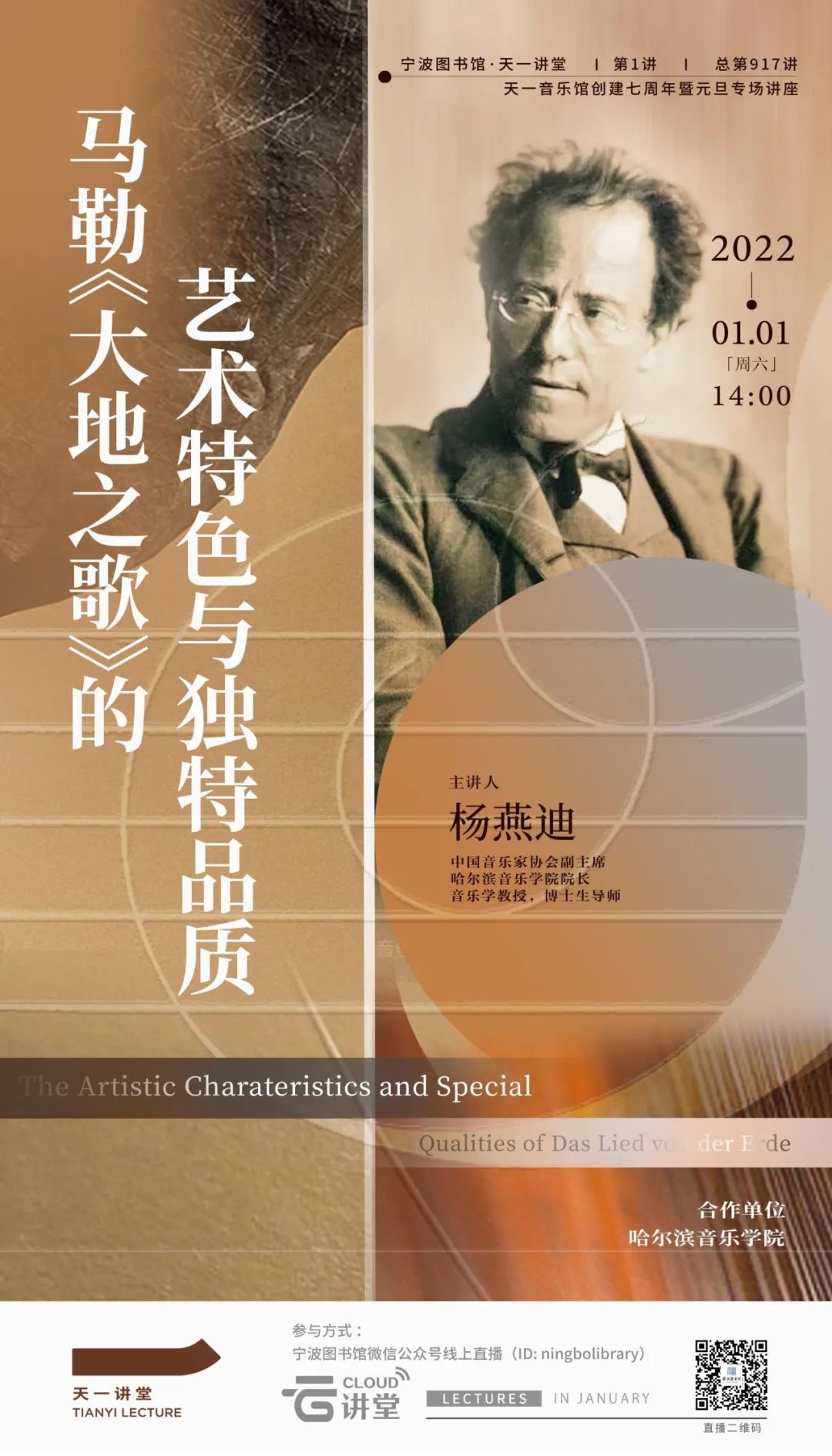1月1日,中国音乐家协会副主席、william威廉亚洲官方院长、音乐学教授、博士生导师杨燕迪做客宁波图书馆天一讲堂·云讲堂,主讲甬图天一音乐馆创建七周年暨元旦专场讲座“马勒《大地之歌》的艺术特色与独特品质”。