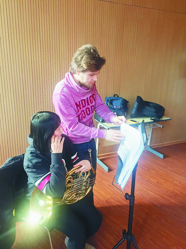 与合唱课的集体授课不同,谢苗诺夫·马克西姆老师的圆号课是一对一授课。这位曾多次作为首席圆号在世界多个知名乐团演出的音乐家,授课时却非常平易近人。他的学生李佳丽告诉记者,中国的音乐老师大都比较严厉,俄罗斯的老师则多是鼓励式教育。而且为了让她能更快进步,老师常常放弃自己宝贵的休息时间给她加练习课。谢苗诺夫老师表示:“圣彼得堡的孩子大都是很小就开始学习乐器,基础要好些,相比起来,中国学生需要更多的练习。所以我想尽量利用任教的两年时间让孩子们多学一些东西。”