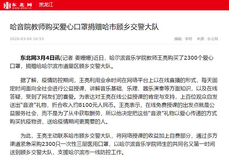 东北网:哈音院教师购买爱心口罩捐赠哈市顾乡交警大队