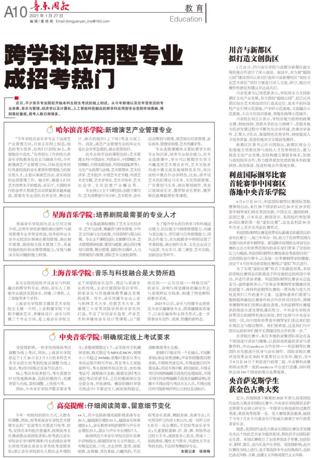 音乐周报:哈音新增演艺产业管理专业